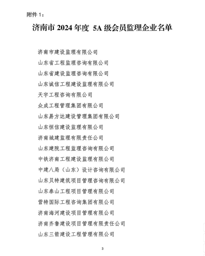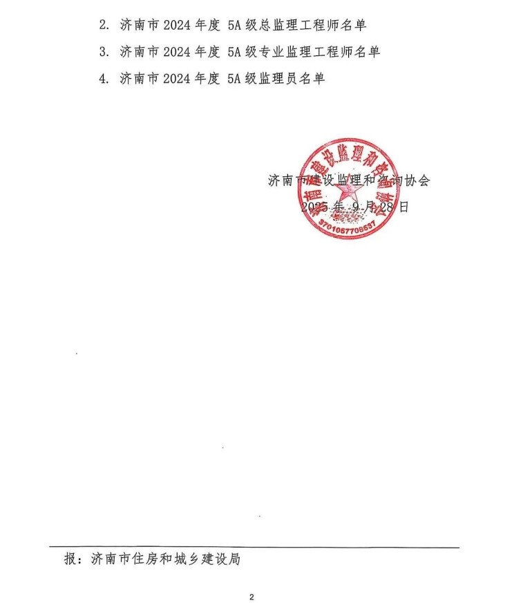 2025年9月份,济南市建设监理和咨询协会公布了《关于公布2024年度监理企业和从业人员5A级考核评价名单的通知》,通过申报、协会综合办公室核验、协会监理专业委员会考核及公示等程序,我公司荣获济南市建设监理和咨询协会2024年度“5A级会员监理企业”,两名同志被授予“2024年度5A级总监理工程师”、两名同志被授予“2024年度5A级专业监理工程师”、一名同志被授予“2024年度5A级监理员”。